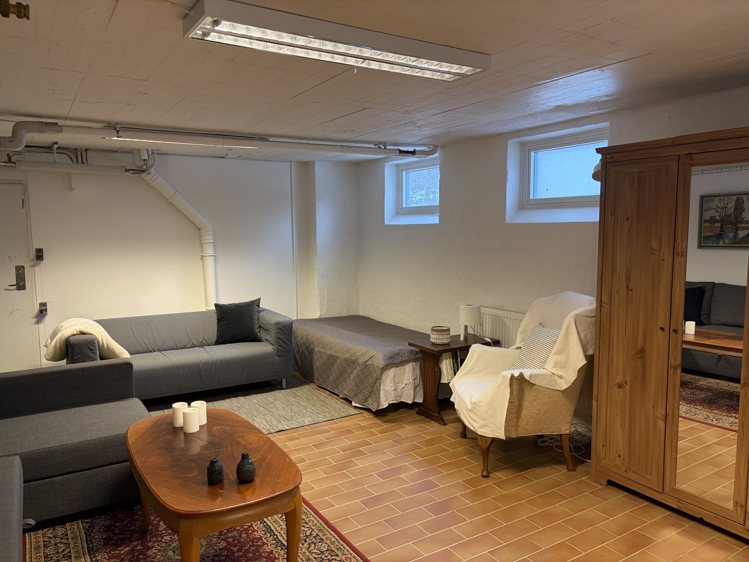 I lokalen finns det: en bäddsoffa (140 cm), en 90 säng, en tältsäng samt en extra madrass. Det finns 3 täcken, 6 kuddar, matbord med plats för 6 personer, kylskåp, micro, vattenkokare och kaffekokare. Samt en vanlig soffa och ett mindre badrum med dusch.